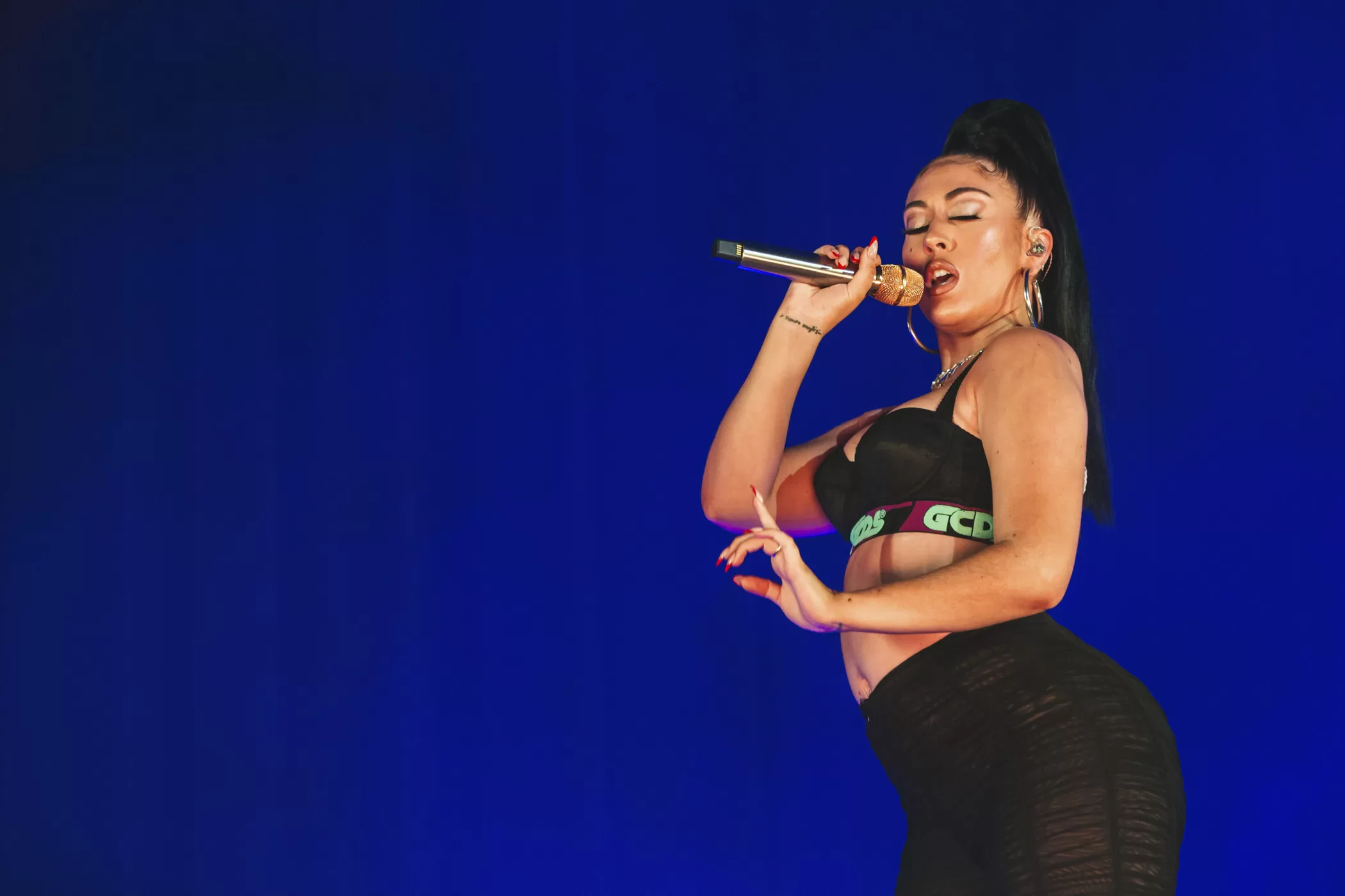 El Acto I es pura explosión latina. Arranca con un nuevo intro seguido de la “Frikitona Intro”, el sample del clásico de Plan B que ya es el primer grito colectivo de la noche antes de que suene una sola nota propia. De ahí, “Muñekita” detona el piso de manera inmediata, estableciendo desde el primer minuto que este show no tiene nada de tibio. Lo que sigue es una seguidilla de canciones de Orquídeas y colaboraciones de su era más latina que mantienen la temperatura alta: “Labios Mordidos”, “Me Pongo Loca”, “Muévelo”, “Pensamientos”, “Hasta Cuando”, “SAD GIRLZ”, “Fue Mejor”, “Diosa”, “Si No Es Contigo”, “Muévete” e “Igual”. Quince canciones en el primer acto, sin parar, como un DJ set que va escalando sin dar tregua.